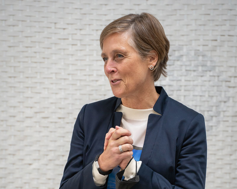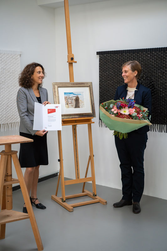 Nach einer bewegenden Laudatio von Mona Neubaur, Landesvorsitzende der Grünen NRW, übergibt Frau Dr. Eva Koch an Corinna Bernshaus die Urkunde zum Preis der Hertie-Stiftung im b-ehrenhof.
